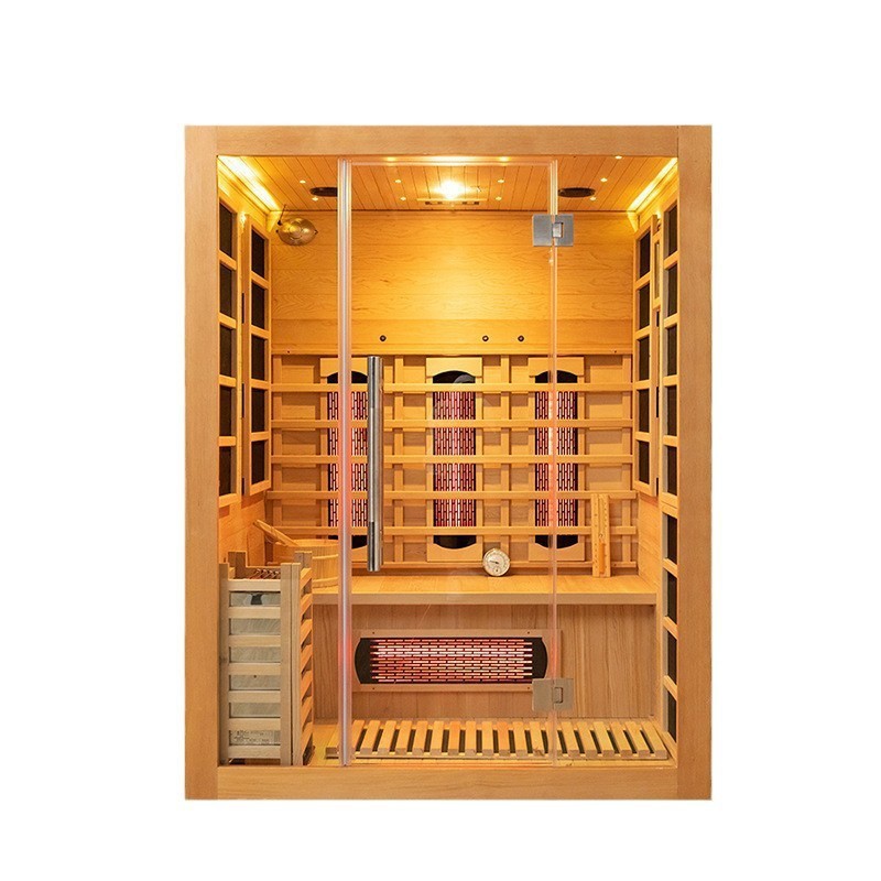 Інфрачервона та парова сауна на 1-3 осіб оснащена розширеними функціями для покращення вашої оздоровчої подорожі: інфрачервоні обігрівачі та інфрачервоні графенові нагрівальні пластини (забезпечують рівномірне, ефективне нагрівання для глибокого, розслаблюючого поту); Кисневий іонізатор (очищає повітря в сауні, створюючи свіжу і бадьорить атмосферу); Світло для читання та динамік (дозволяє читати або слухати музику, насолоджуючись сеансом у сауні); Панель керування (дає змогу легко регулювати температуру, час та інші параметри для персоналізованого досвіду); Піч для сауни та світлова хвильова труба (працюють разом для створення пари та інфрачервоного тепла, обслуговуючи як парову, так і інфрачервону сауну).