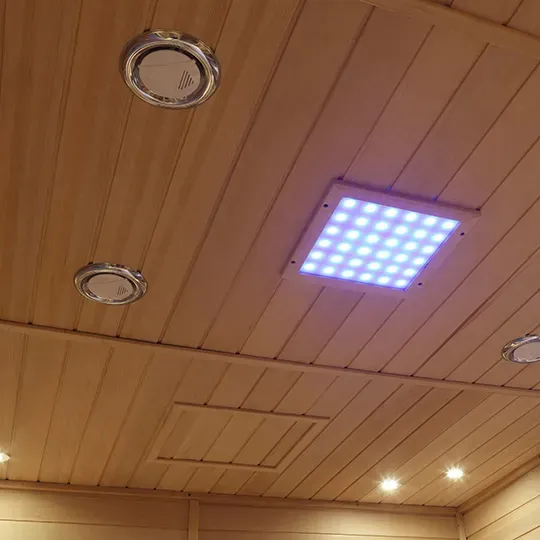 3. Нагрівання та освітлення: рівномірно розподілені нагрівальні панелі далекого інфрачервоного випромінювання забезпечують ніжне, проникаюче тепло; верхнє + бокове освітлення (у теплих тонах) сприяє розслабленню та уникає задухи чи пригнічення