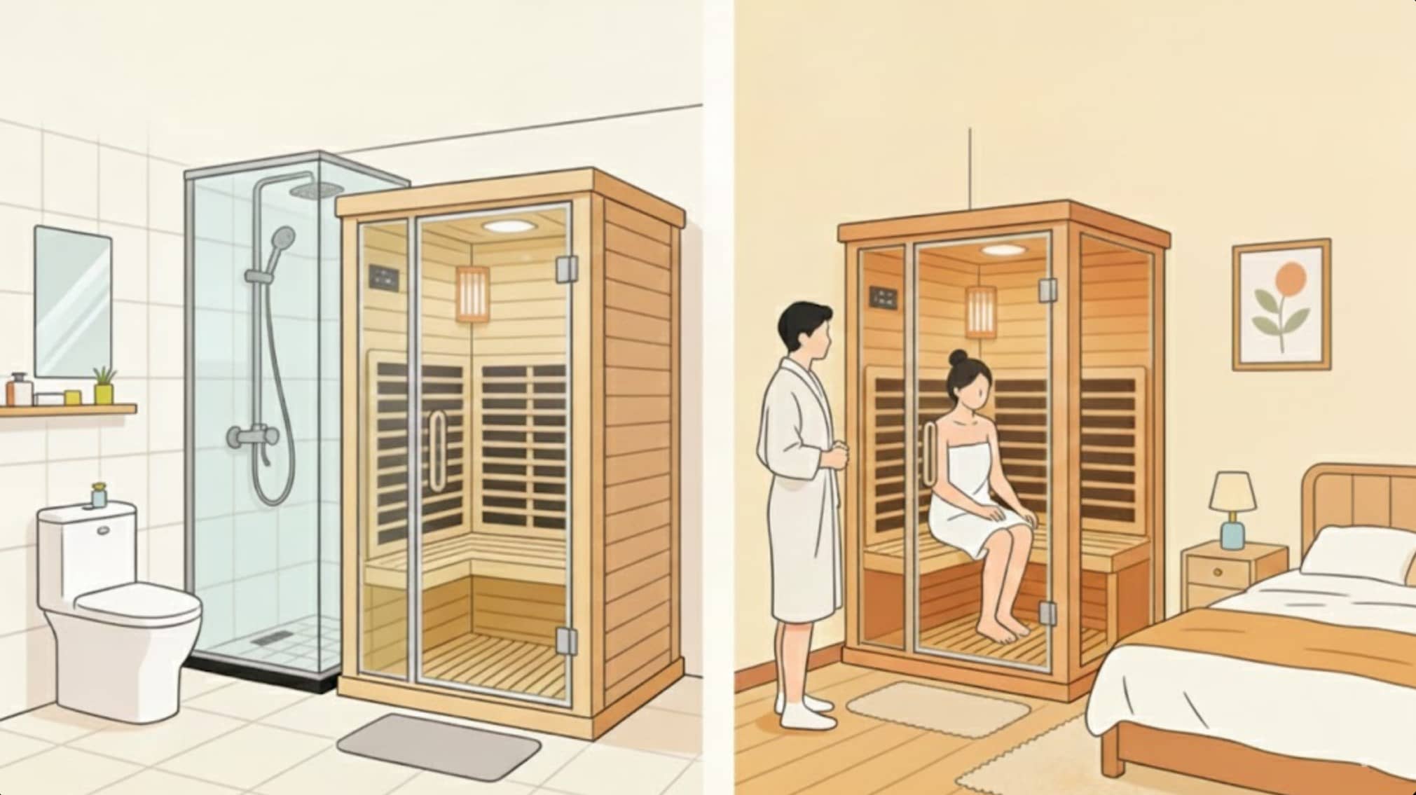 Два типи саун не виключають один одного і можуть використовуватися в поєднанні відповідно до пори року — використовуйте сауни з дальнім інфрачервоним випромінюванням влітку (сухі та незадушливі, уникаючи накладання вологого тепла); взимку користуватися паровими саунами (теплими і зволожуючими). Сім’ї з проблемами можуть прийняти план «частковий ремонт + гнучка добавка»: встановити модуль парової сауни у ванній кімнаті та розмістити невелику інфрачервону сауну в спальні/балконі, щоб максимально задовольнити потреби здоров’я.
