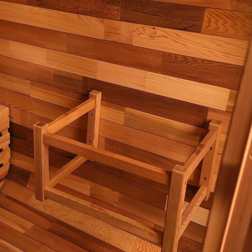 - Основний матеріал: високоякісна жаростійка масивна деревина (стіни, лавки та каркас — це тверда деревина), професійно оброблена для захисту від вологи та тепла, щоб адаптуватися до середовища сауни з високою температурою та високою вологістю.