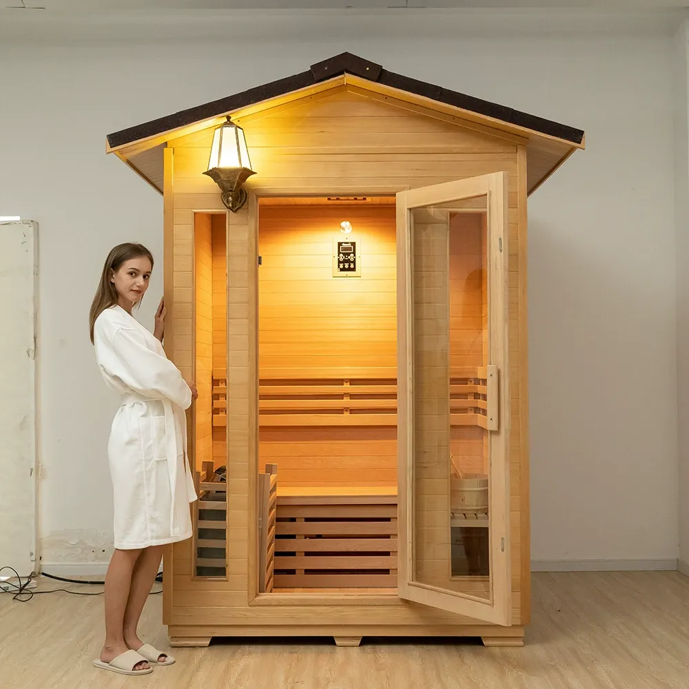 Традиційна система опалення банної печі відновлює відчуття класичної парової лазні. Оснащений інтелектуальною системою контролю температури, він може точно регулювати температуру пари та тривалість, гарантуючи, що кожна сауна досягне ідеального стану. Пар рясний і рівномірно розподіляється, а тепле тепло огортає все тіло, створюючи комфортну та приємну обстановку сауни. Дизайн верхніх скляних дверей Fengshui є геніальним, прозорим і красивим, водночас натякаючи на сприятливість. Ретро-настінний світильник (вулична водонепроникна модель), встановлений біля дверей, випромінює тепле м’яке світло, коли горить вночі, а низьковольтна вибухозахищена лампа всередині забезпечує безпечне використання, демонструючи продуманість у кожній деталі. Напруга підтримує глобальне налаштування, а завдяки адаптивному кабелю високої потужності використання електроенергії поза приміщенням безпечне та безтурботне.